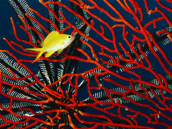 Ένα εντυπωσιακό κόκκινο κοράλλι λειτουργεί ως φόντο για ένα χρυσόψαρο damselfish στα νερά του νησιού Namenalala των Φίτζι.